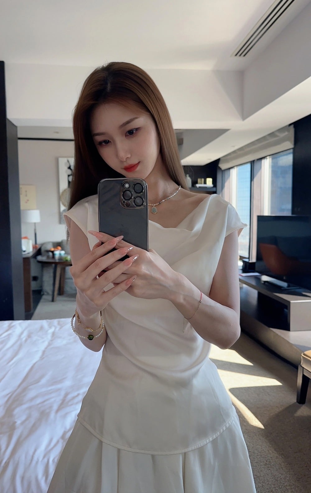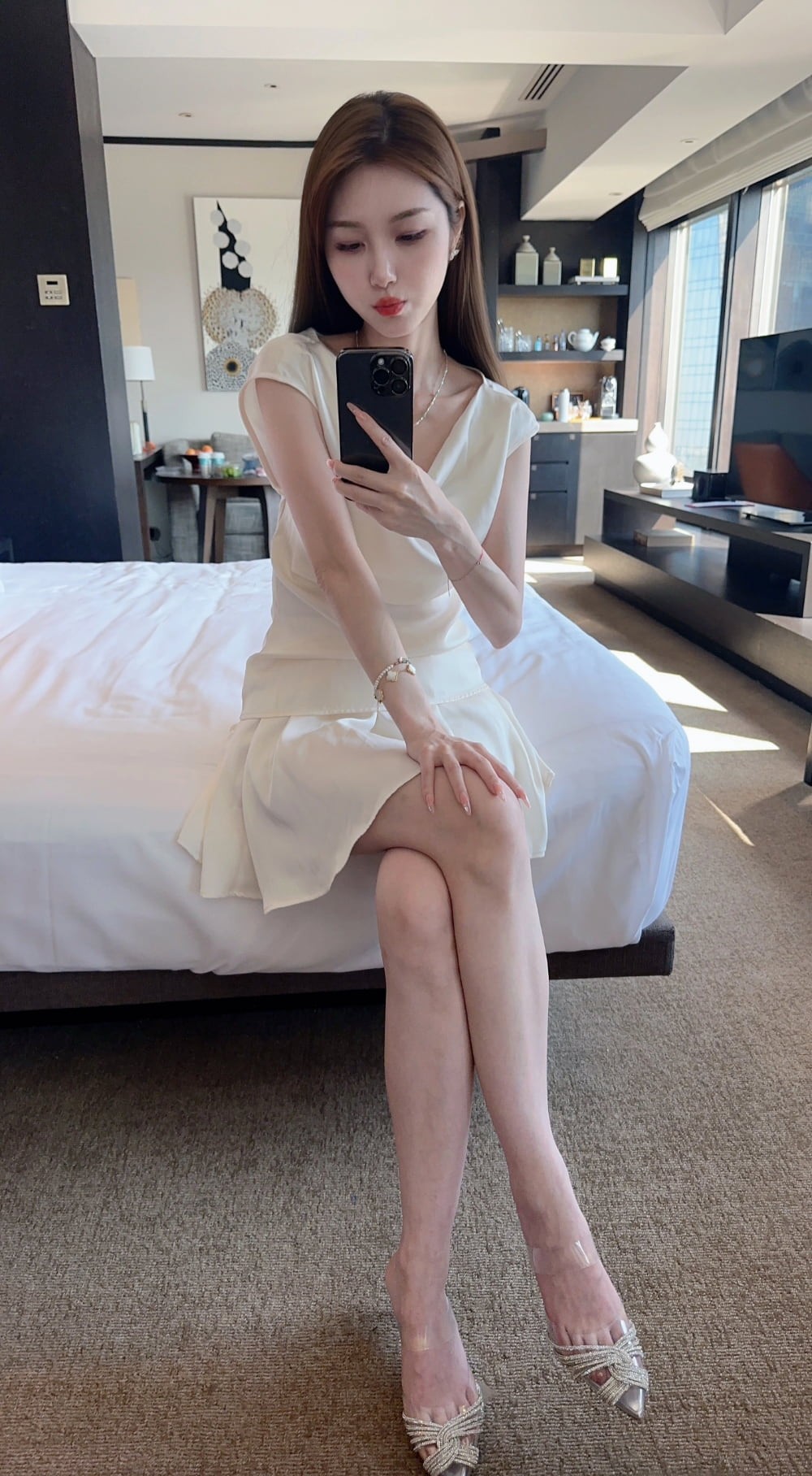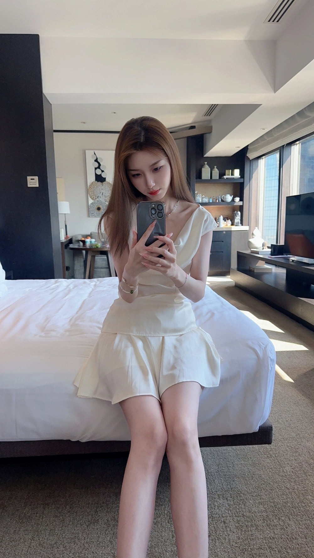 高超的摄影技巧,是这组照片得以“封神”的关键。从姿势构图来看,拍摄者深谙人像摄影中“扬长避短”之道。通过侧身站立、交叉腿、轻微扭胯等姿势,极大程度地优化了身体曲线,显得人身姿修长、体态优雅。其中一张照片,小姐姐倚靠廊柱,目光宁静望向远方,这个动作不仅使人物与环境产生互动,更勾勒出一种从容、自信的“知性姐姐”魅力,生动而自然。在光影运用上,照片巧妙利用了酒店空间的设计光源。有的场景,人物置身于明暗交界处,面部轮廓被柔和光线勾勒,肌肤质感通透;有的则借助巨大的落地窗,让京城的自然天光为人物披上一层朦胧光晕,与裙装上的细腻光泽交相辉映,尽显高级。