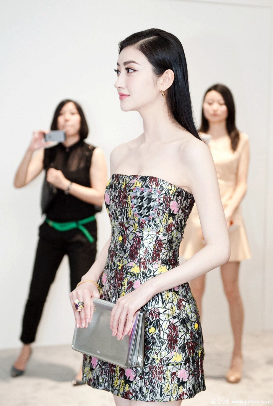 造型的亮点在于细节之处的精妙点缀。景甜手中那把灰蓝色的中式团扇,与裙装形成了含蓄而美妙的撞色,扇柄的精致装饰悄然流露不凡品味。颈间与耳畔佩戴的绿色珠串项链与耳饰,则是整体搭配的点睛之笔。那一抹清雅的绿色,不仅与她白皙的肌肤相映生辉,更为整体棕色调的造型注入了一股鲜活的生命力与复古的温婉气息。妆容上,一抹提气色的红唇成为面部的焦点,明艳而不张扬,恰到好处地平衡了整体造型的素雅,彰显出柔中带刚的女王气场。