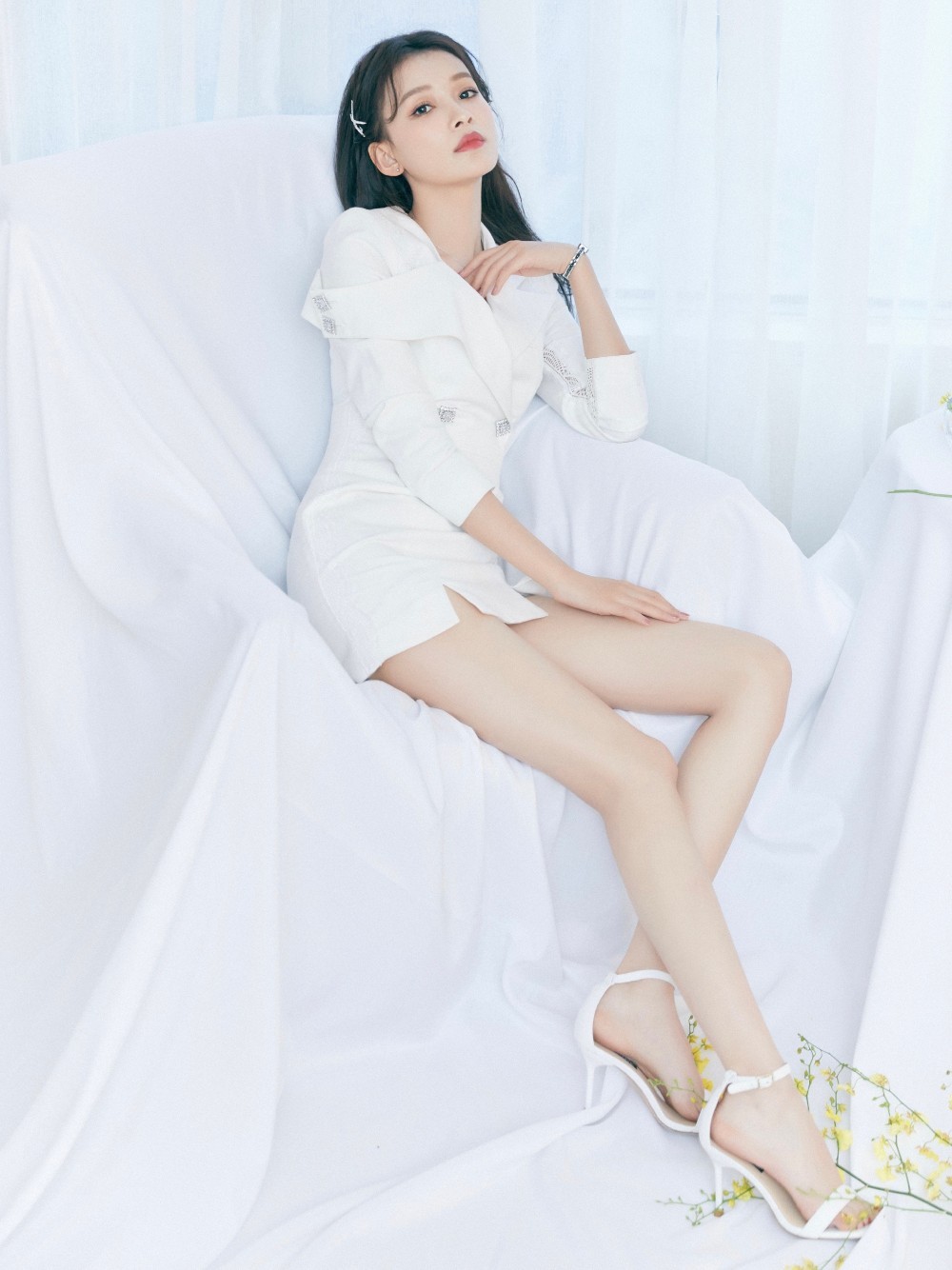 这套造型的精髓在于其极致的对比与平衡。上身是剪裁利落、线条流畅的白色西装或衬衫,奠定了专业与干练的基调。而下半身搭配的同色系超短裙,则瞬间打破了传统职业套装的沉闷感,成为整个造型的“神来之笔”。短裙恰到好处的长度,毫无保留地展现出孙怡那双笔直修长、白皙匀称的绝美双腿,视觉上极大地拉长了身体比例,堪称“比例逆天”。这种“上保守下张扬”的穿搭哲学,正是当下最受欢迎的“甜酷”风格典范——在专业感中透露一丝不羁,在清新甜美中蕴含强大气场。