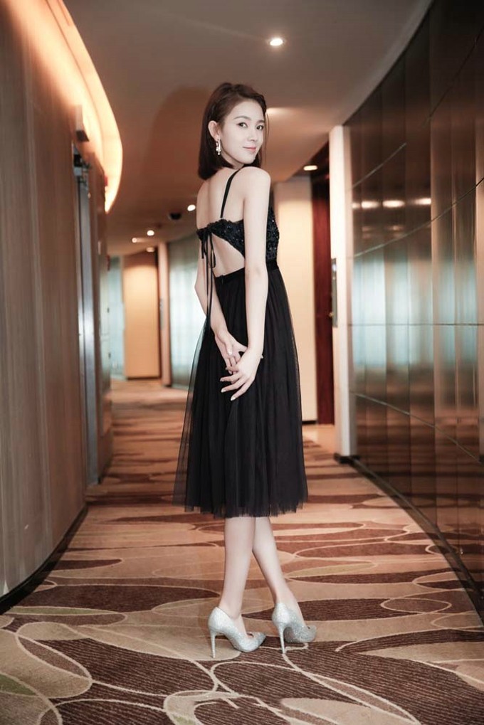 这组写真的整体造型堪称点睛之笔。礼服裙巧妙融合了细腻的蕾丝与轻盈的欧根纱,上面点缀着精致的刺绣和水晶钉珠,细节之处尽显华丽。特别是背部的吊带与露背设计,大方展现出优美的背部线条,让她在人群中宛若会发光的小仙女,一切都美得刚刚好。